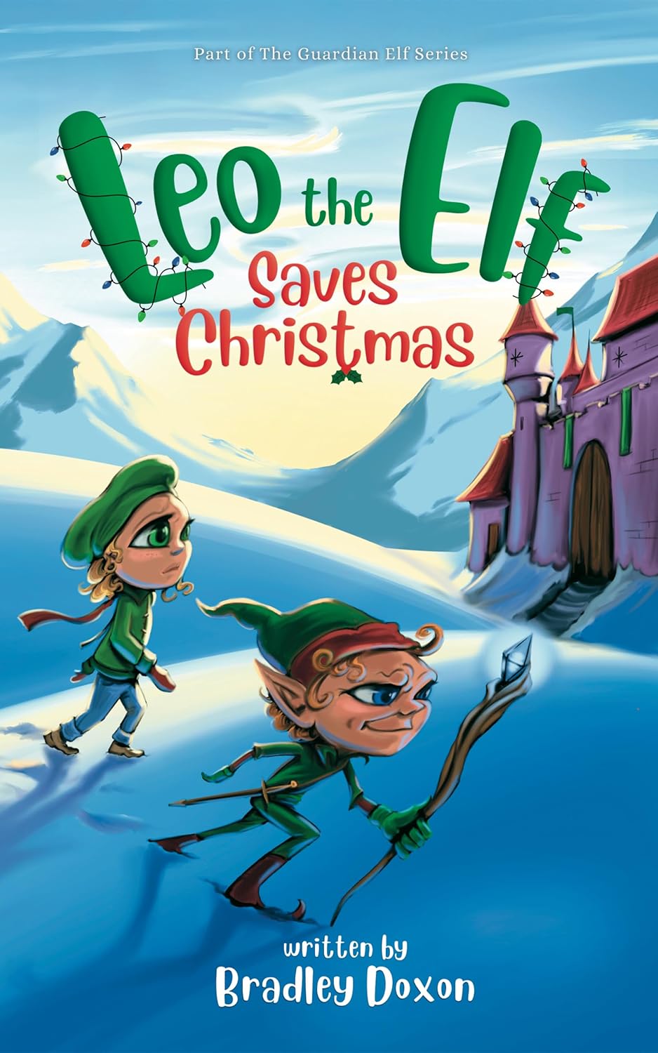 A hardcover copy of Leo the Elf Saves Christmas signed by author Bradley Doxon.